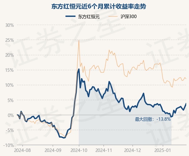 本站消息,1月27日,东方红恒元最新单位净值为1.3123元,累计净值为1.3123元,较前一交易日上涨1.06%。历史数据显示该基金近1个月上涨0.43%,近3个月下跌3.82%,近6个月上涨3.71%,近1年上涨1.06%。该基金近6个月的累计收益率走势如下图: